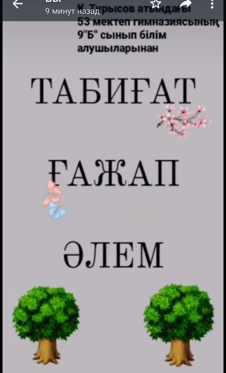Қаратай Тұрысов атындағы №53 мектеп-гимназияда 13 желтоқсан күні 5-10 сыныптар арасында «Табиғат-ғажап әлем» бейнероликтер байқауы ұйымдастырылды.Байқаудың негізгі мақсаты- білім алушылардың бойына адамгаршілік асыл қасиеттерді,табиғаттың шын жанашырлары бола білуге,Жер- Ананы сақтай білуге дағдыландыру.