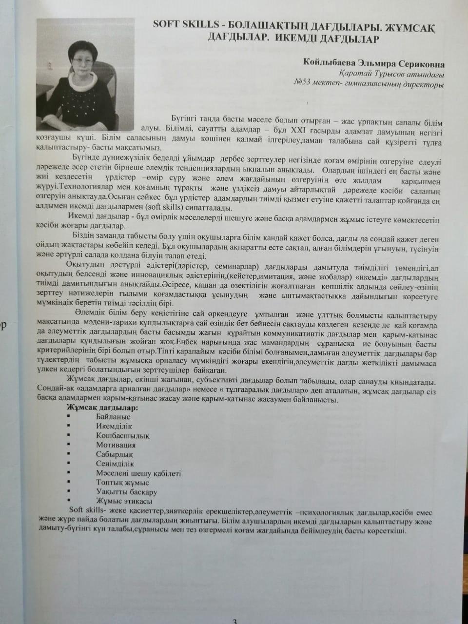 Soft skills- жеке қасиеттер,зияткерлік ерекшеліктер,әлеуметтік –психологиялық дағдылар,кәсіби емес және жүре пайда болатын дағдылардың жиынтығы. Білім алушылардың икемді дағдыларын қалыптастыру және дамыту-бүгінгі күн талабы,сұранысы мен тез өзгермелі қоғам жағдайында бейімдеудің басты көрсеткіші.