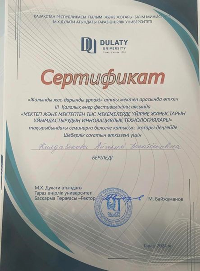 "МЕКТЕП ЖӘНЕ МЕКТЕПТЕН ТЫС МЕКЕМЕЛЕРДЕ ҮЙІРМЕ ЖҰМЫСТАРЫН ҰЙЫМДАСТЫРУДЫҢ ИННОВАЦИЯЛЫҚ ТЕХНОЛОГИЯЛАРЫ" тақырыбындағы семинарға белсене қатысып, жоғары деңгейде шеберлік сағатын өткізгені үшін Қалдыбекова Айгерім Болатбекқызына сертификат пен алғыс хат