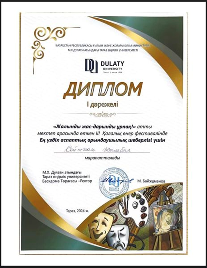16 апрель 2024 0 1 2 3 4 5 үшін Сейтхан Жамбыл жүлделі І орынмен марапатталды. Жетекшісі: Сихымбай Айдана Нұрбайқызы