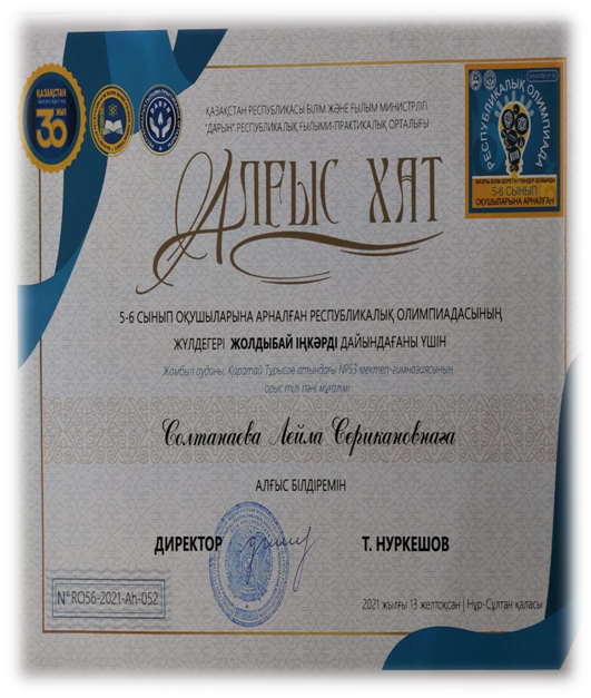 5 сынып білім алушысы Жолдыбай Іңкәр орыс тілі мен әдебиеті пәні бойынша ІІ орын, жетекшісі - Солтанаева Лейла Серикановна жүлдегер дайындағы үшін алғыс хатпен марапатталды.