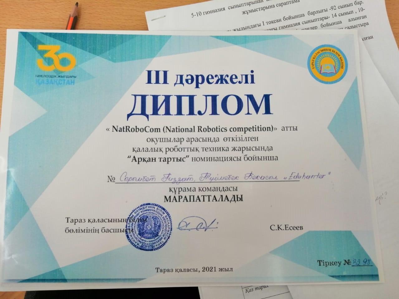 «NatRoboCom (National Robotics compеtition)» атты оқушылар арасында өткізілген қалалық роботтық техника жарысында «Арқан тартыс» номинациясы бойынша №53 мектеп – гимназиясы 6 «З» сынып білім алушылары Сырымбет Ғиззат Бектұрғанұлы мен Түймебек Бекасыл Кемелұлы «Eduharrter» құрама командасы марапатталды. Жетекшісі - Кандашбек Шохан Азимханович.