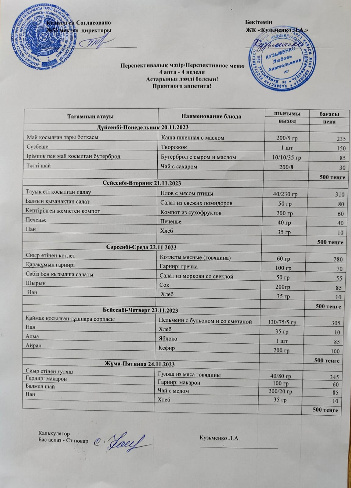 20.11 - 24.11.2023ж апталық мәзір