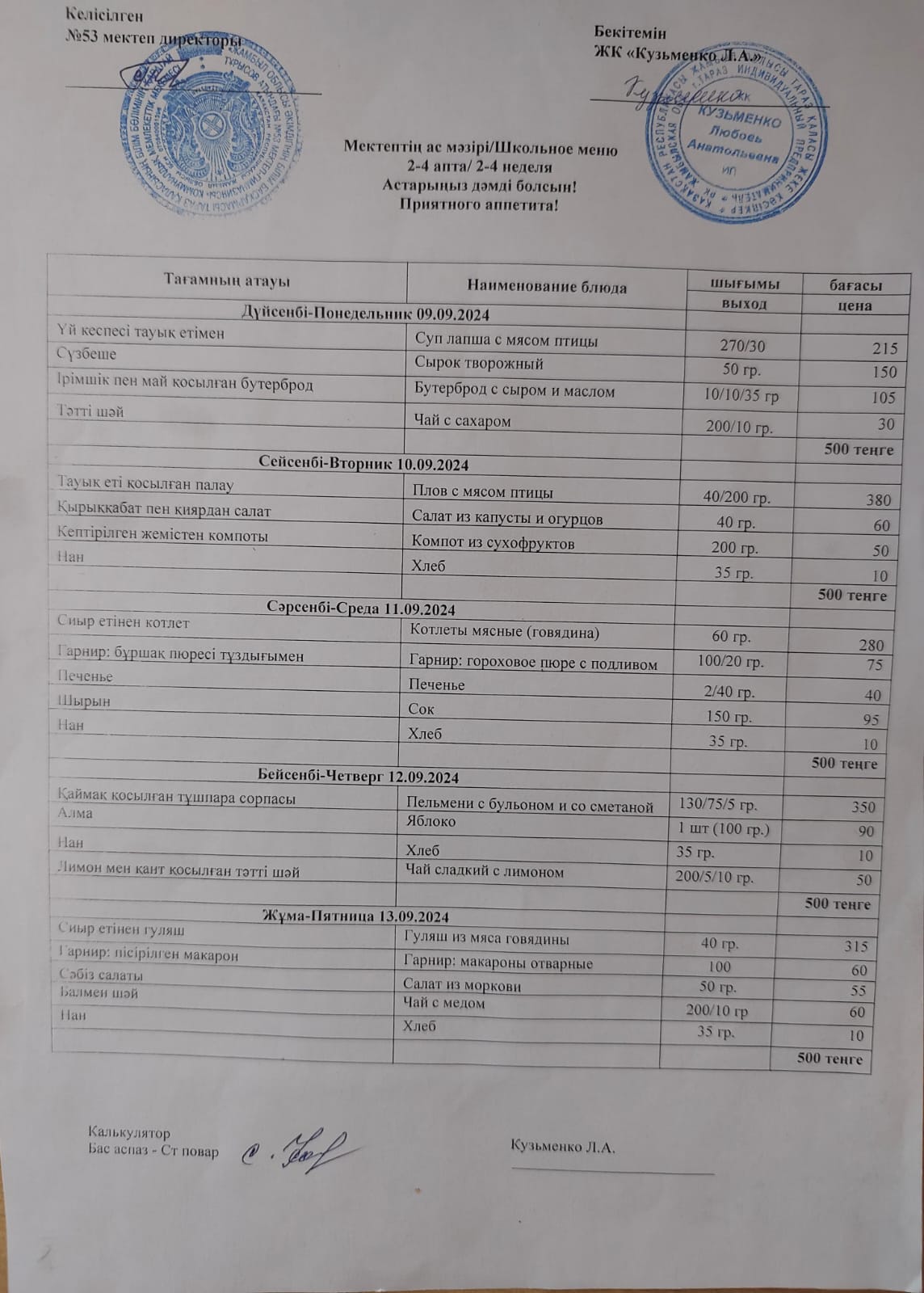 9.09.2024ж - 13.09.2024ж апталық ас мәзірі » СШ №53