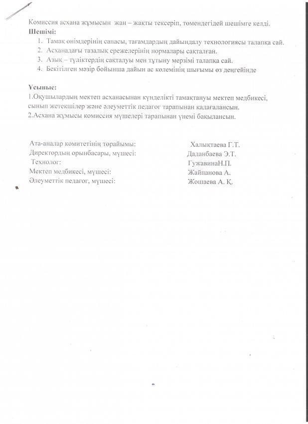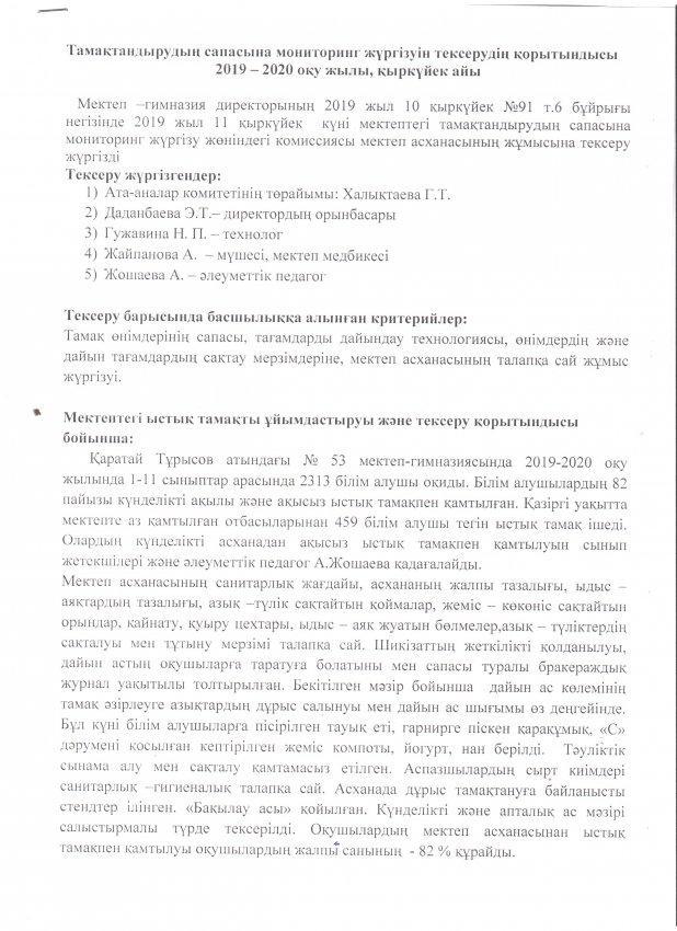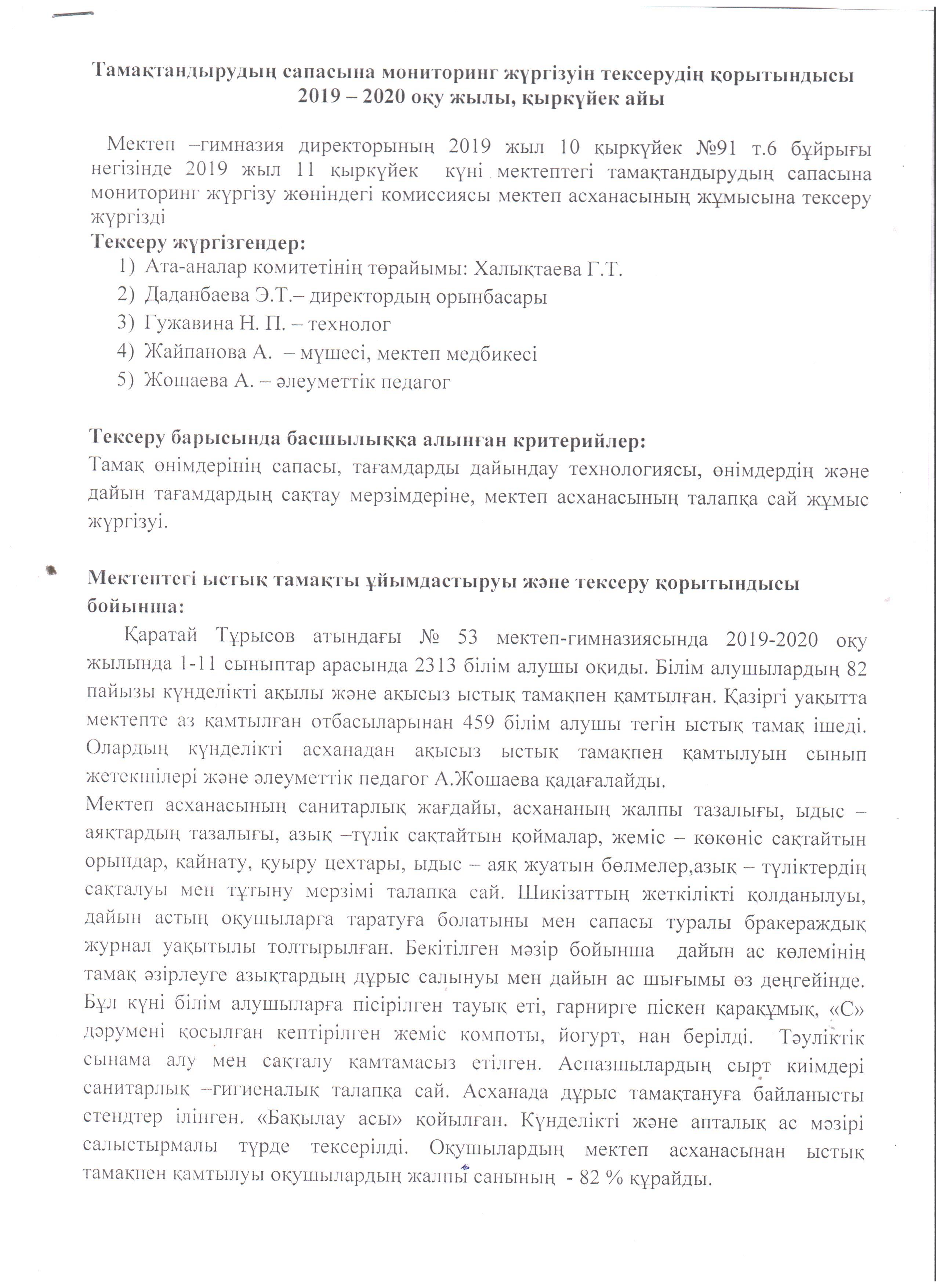 11 сентябрь 2019 0 1 2 3 4 5 Тамақтандырудың сапасына мониторинг жүргізуін тексерудің қорытындысы 2018 – 2019 оқу жылы, қаңтар айы