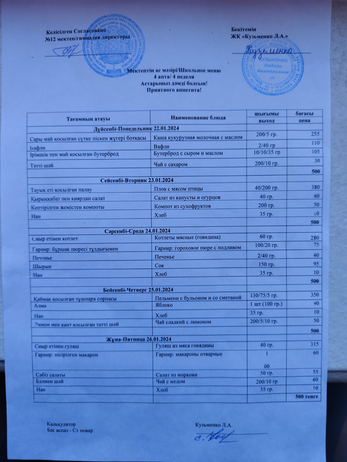 » » » Апталық мәзір 22.01. - 26.01.2024ж